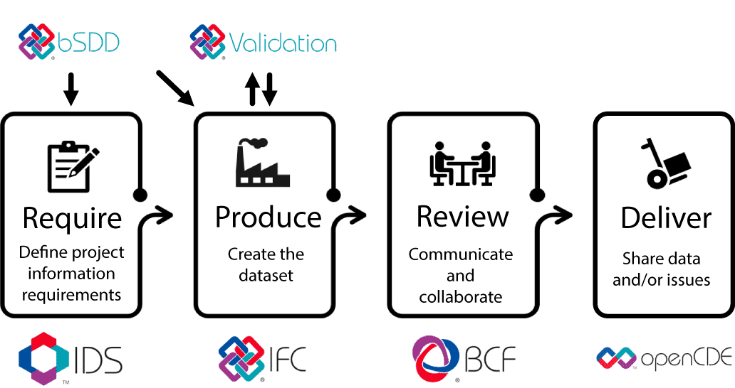 buildingSMART International har utviklet et sett av standarder for å ivareta åpenBIM-informasjonsflyt i hele verdikjeden.